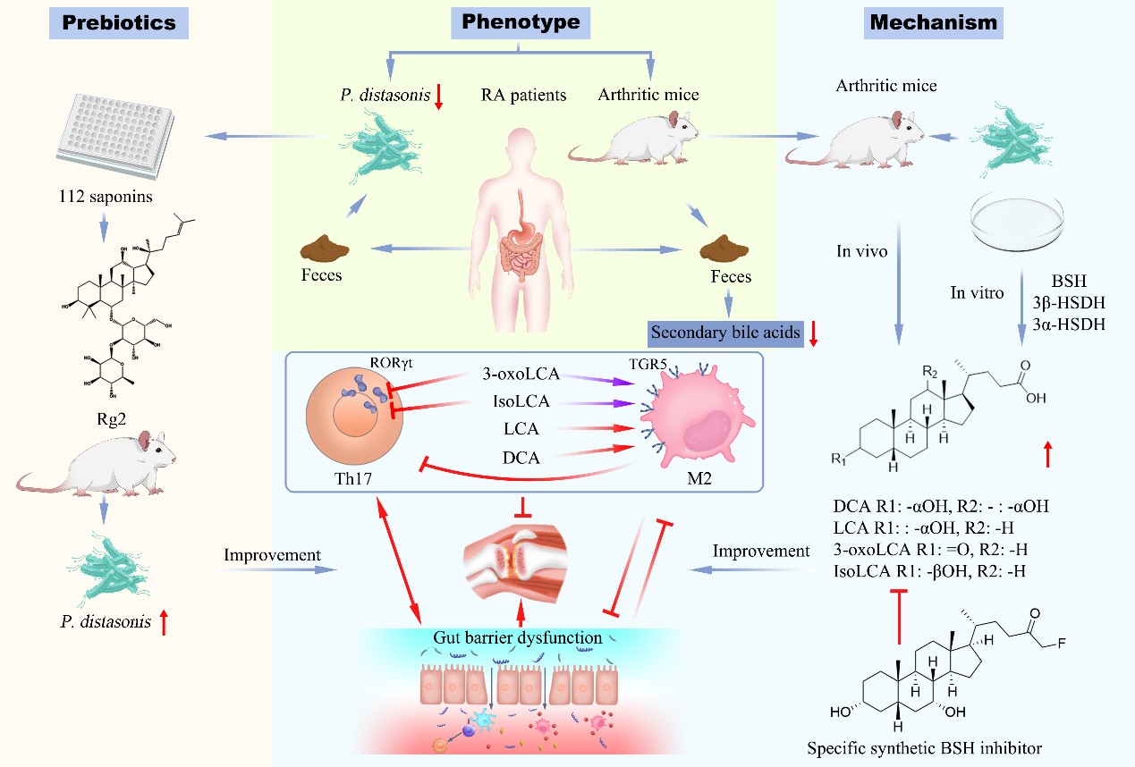 本文研究揭示了P. distasonis作为候选益生菌、人参皂苷Rg2等作为益生元治疗RA的潜力和作用机制,为RA的肠道微生态精准治疗和中医药干预提供了新思路与新方法;同时也为阐释中药三七基于活血化瘀、消肿止痛之功效防治RA的现代科学内涵提供了依据。