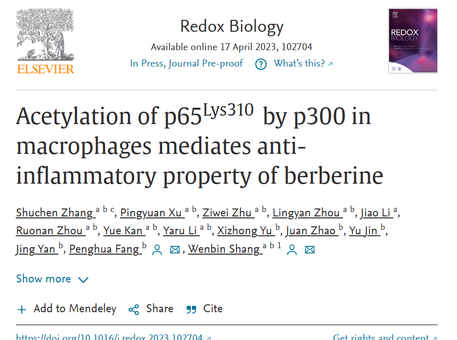 近日,best365第一临床医学院代谢病中医研究重点实验室尚文斌教授团队在国际知名学术期刊Redox Biology(中科院生物学一区,IF: 10.787)上发表中药黄连活性成分小檗碱抗炎作用机制方面的最新研究成果:“Acetylation of p65Lys310 by p300 in macrophages mediates anti-inflammatory property of berberine”。