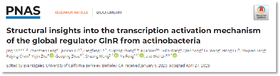 2023年5月23日,best365足球官网医学院﹒整合医学学院,附属鼓楼临床医学院林炜教授课题组和浙江大学冯钰教授团队、中国科学院分子植物卓越创新中心赵国屏院士团队以及中国科学院物理所王爽研究员团队在国际著名期刊美国科学院院刊Proceedings of the National Academy of Sciences of the United States of America(中科院一区,IF:12.779)上发表了题为“Structural insights into the transcription activation mechanism of the global regulator GlnR from actinobacteria”的研究成果。该研究捕获了结核分枝杆菌GlnR依赖型基因转录激活复合物结构,揭示了全局性转录调控蛋白GlnR选择性调控基因转录的分子机制,为全面认识结核分枝杆菌和整个放线菌的代谢调控机制奠定了基础。该工作是林炜教授团队继Mol. Cell(2017, 2018)、Nat Commun(2019)、Nucleic Acids Res(2020, 2021, 2022a, 2022b)之后在病原菌基因转录调控机制研究和新型抗耐药菌药物靶点发现领域取得的又一项全新研究成果。