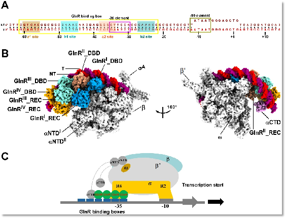图1. 结核分枝杆菌GlnR依赖型转录激活复合物的冷冻电镜结构。