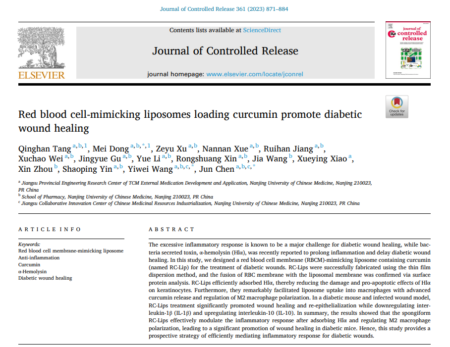 2023年8月30日,我校江苏省中医外用药开发与应用工程研究中心陈军、王裔惟教授团队在药剂学国际权威期刊Journal of Controlled Release(国际控制释放学会官方杂志,IF10.8,中科院1区)发表姜黄素纳米海绵脂质体治疗糖尿病溃疡的研究论文。