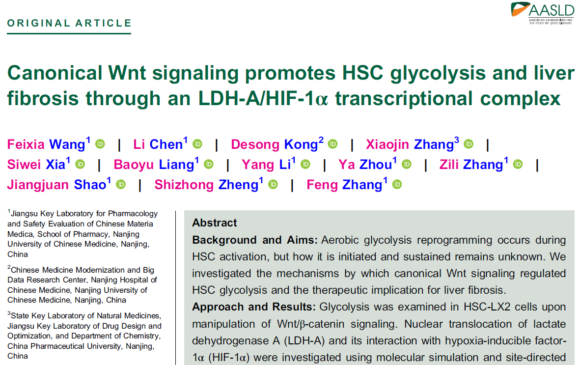 2023年9月,best365足球官网药学院郑仕中、张峰教授团队在国际权威期刊、肝脏病学顶级杂志Hepatology(IF13.5,中科院一区)发表了题为Canonical Wnt signaling promotes HSC glycolysis and liver fibrosis through an LDH-A/HIF-1α transcriptional complex的最新研究成果。