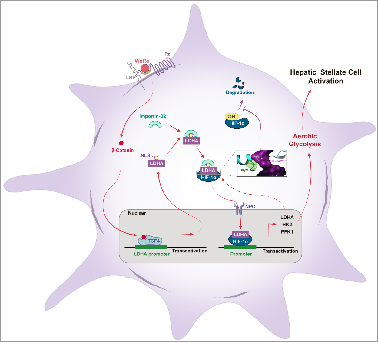 肝纤维化是多种慢性肝病的共同病理过程,逆转肝纤维化是有效治疗慢性肝病的关键。肝星状细胞(HSC)活化是肝纤维化病变的核心环节。近年来发现HSC活化时发生糖酵解代谢重编程,但如何启动并维持该过程尚未明晰。该研究发现HSC中Wnt/β-Catenin信号通路通过TCF4依赖性机制增强LDH-A的转录与表达,并促进其核易位。进一步发现,LDH-A通过其氨基酸残基Gly28与HIF-1α的氧依赖降解结构域(oxygen-dependent degradation domain)相互作用并形成复合物,阻碍了HIF-1α的氧依赖性降解过程,结果导致HSC内HIF-1α保持较高的含量。LDH-A/HIF-1α复合物进入细胞核后,显著增强了包括LDH-A在内的多个糖酵解关键基因的转录与表达,从而形成正反馈调控机制维持HSC内糖酵解代谢处于高水平状态。β-Catenin抑制剂和LDH-A抑制剂分别从不同环节阻断上述过程,抑制HSC糖酵解代谢及活化,表现出显著的抗肝纤维化作用。