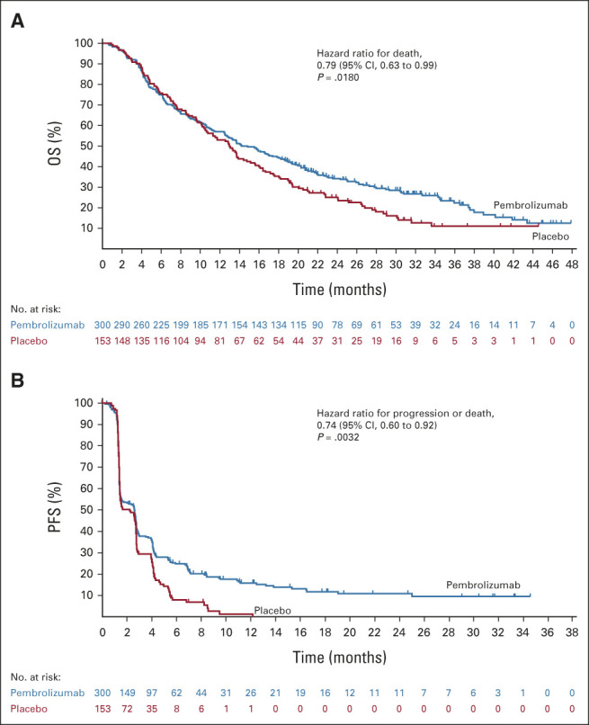KEYNOTE-394是一项Ⅲ期、双盲、随机对照研究(NCT03062358),旨在探究帕博利珠单抗联合最佳支持治疗(BSC;试验组)对比安慰剂联合BSC(对照组)在既往经治、肝细胞癌亚洲人群二线治疗中的疗效和安全性,主要终点为总生存期(OS),次要终点为无进展生存期(PFS)、客观缓解率(ORR)、缓解持续时间(DoR)、疾病控制率(DCR)、进展时间、安全性及耐受性。