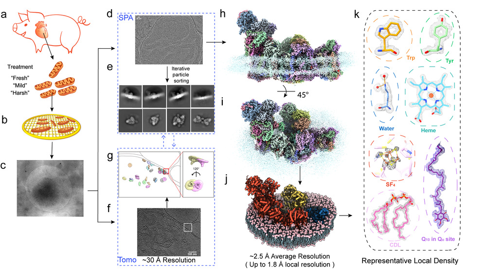 朱家鹏研究团队突破了蛋白质纯化的传统概念和冷冻电子显微镜技术的束缚,首次实现了在完整的细胞器水平上对心脏来源的线粒体进行超高分辨率成像,可直接从线粒体上精准捕获生命过程的一瞥,精确到了近乎原子级别的细节。