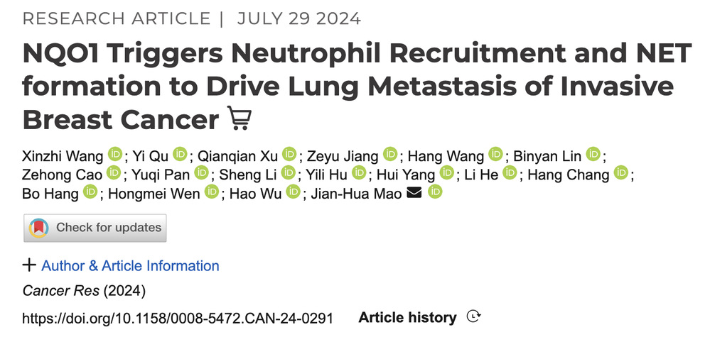 近期,best365足球官网药学院吴皓教授和王欣之教授团队与美国劳伦斯-伯克利国家实验室毛建华教授合作,在肿瘤学研究权威期刊《Cancer Research》(中科院医学一区,IF:12.5)发表了题为《NQO1 Triggers Neutrophil Recruitment and NET Formation to Drive Lung Metastasis of Invasive Breast Cancer》的最新研究成果。