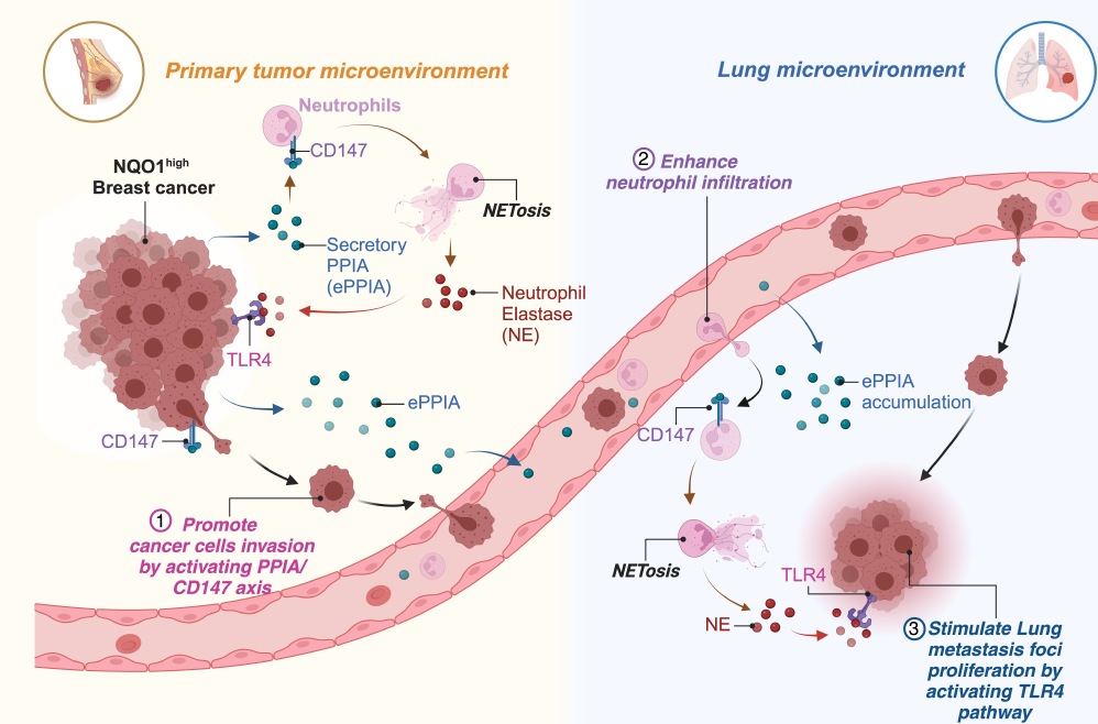 乳腺癌肺部转移是患者死亡的主要原因之一,因此迫切需要开发新的靶标和疗法来预防和治疗这种转移。该研究创新性地揭示了NAD(P)H:醌氧化还原酶1(NQO1)在乳腺癌肺转移中的调控机制。研究发现,NQO1通过抑制亲环素A(PPIA)在关键半胱氨酸残基C161处的氧化,稳定并上调了其在乳腺癌细胞中的表达。PPIA激活了促进细胞侵袭的CD147通路,诱导恶性乳腺癌细胞的侵袭。此外,NQO1通过诱导PPIA的胞外分泌,调节了原发和肺转移部位的免疫环境。NQO1高表达的乳腺癌细胞分泌的PPIA与中性粒细胞上的CD147结合,促进了肺部和肿瘤处中性粒细胞的浸润,并触发了中性粒细胞外陷阱(NET)的生成和中性粒细胞弹性蛋白酶(NE)的释放,形成免疫抑制的微环境,促进了肿瘤侵袭和肺部定植。进一步研究发现,药物靶向PPIA可以有效抑制NQO1介导的乳腺癌肺转移。综上,该研究揭示了一个未被认识的驱动乳腺癌肺转移的NQO1-PPIA-CD147-NET轴,抑制这一轴是限制乳腺癌患者肺转移的潜在治疗策略。