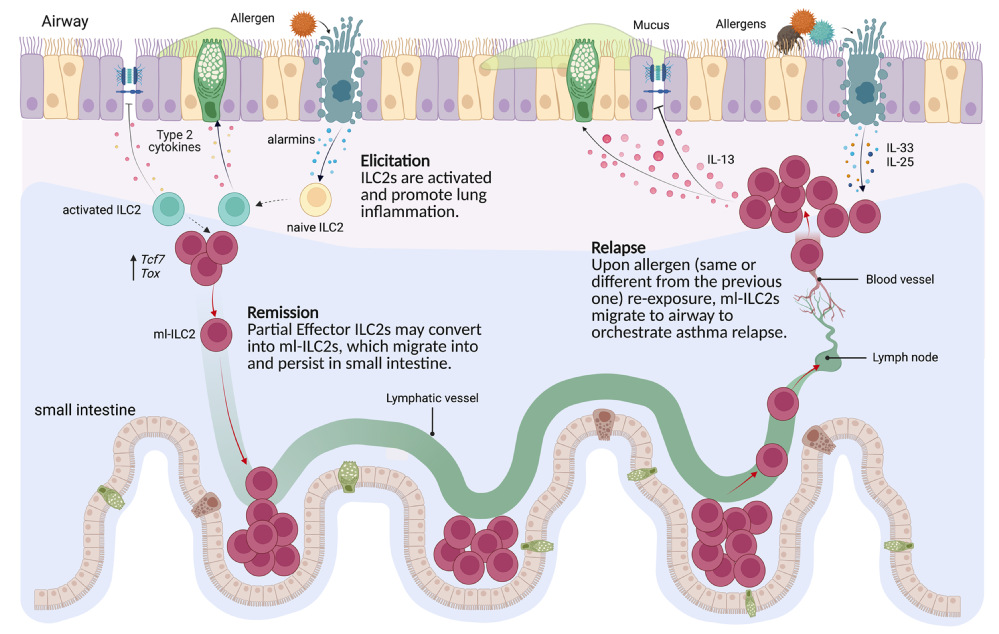 本研究首次发现了哮喘中一群关键的新表型固有淋巴细胞,为理解哮喘反复发作的病理机制提供新角度;小肠固有层是记忆性ml-ILC2细胞长期贮存的仓库(reservoir),其后续迁移至肺部介导复发的特性为深入理解肠道作为免疫组织器官及“肺肠轴”作出新证据;哮喘缓解期靶向ml-ILC2细胞(干预迁移信号、关键转录因子等)为从根本上治疗哮喘提供新思路。