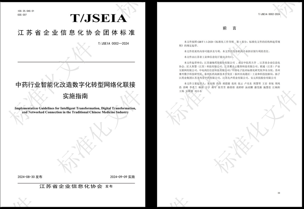 2024年9月9日,由best365足球官网、江苏康缘药业股份有限公司组织编制的《江苏省中药行业智能化改造数字化转型网络化联接实施指南》团体标准正式对外发布。该指南是我国中药制药过程控制与智能制造技术领域首部“智改数转网联”的团体标准,面向解决中药行业生产制造工艺落后、信息基础设施薄弱、安全质量监管困难等行业痛点,从智能化基础支撑、企业关键环节建设管理出发,全面实现企业智能装备、过程控制系统、状态监测系统、生产、经营管理等系统的数据互通、数据互融和业务协同,促进企业生产管控一体化。依托数字化、网络化、智能化能力,保障数据安全、网络安全、工控安全,实现中药企业数字化设计建设、中药行业产业链上下游、中药企业与管理部门以及服务部门的高效联接协同发展,全面提升中药行业高质量发展能力和水平。