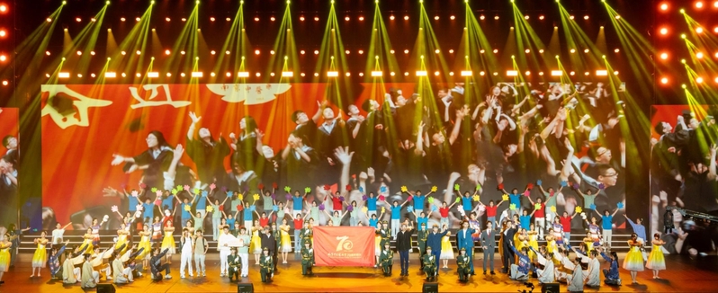 光影交错,荧光闪闪;载歌载舞,七秩同欣。14个精彩节目依次上演,用一场声光电、音诗画高度融合的舞台,献礼学校七十周年校庆。“钟山脚下、扬子江畔,杏林学子济济一堂……”当熟悉的校歌响起,校领导、国(境)外合作院校代表上台亲切慰问参演师生,并与全体演职人员合影留念。校庆文艺晚会在雄壮的校歌中圆满落下帷幕。
