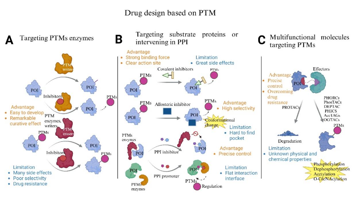 2024年11月29日,best365足球官网杨烨、顾春艳教授课题组在Pharmacology & Therapeutics期刊在线发表题为“Exploring the landscape of post-translational modification in drug discovery”的综述。翻译后修饰(PTMs)在增加蛋白质的多样性、参与多种分子调控机制等方面具有重要作用,其失调通常与多种疾病密切相关。在医药发展历史进程中,靶向PTMs的药物,如:激酶抑制剂、表观遗传药物和蛋白质水解靶向嵌合体等为促进人类健康发展做出了重大贡献。在药物开发中,对PTMs的关注将众多研究者们引入了精准医疗和个性化医疗的新时代,从而实现对传统药物局限性的不断突破。然而,当前在药物发现领域,研究者们对PTMs的理解仍缺乏全面的框架体系。该文章系统性地提出了针对PTMs的药物设计策略,包括直接靶向PTMs过程中的酶、靶向修饰的底物蛋白、干预底物蛋白和PTMs酶相互作用和利用多功能分子调节修饰水平的方法。此外,文章还总结了针对这些策略的最新药物研发成果,分析了相关分子的优势和不足之处,为后续药物开发提供了坚实的理论依据。该综述揭示了PTMs在药物发现及精准医疗中的重要性,为未来的药物研发与治疗策略制定提供了崭新的视角。