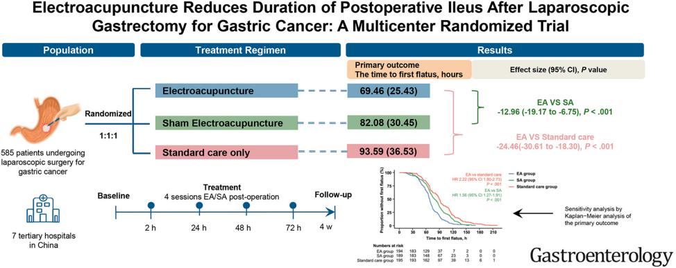 该研究采用多中心随机对照试验设计,由江苏省中医院、四川大学华西医院、温州医科大学附属第一医院、南京鼓楼医院、上海中医药大学附属岳阳中西医结合医院、湖南中医药大学第一附属医院和江苏省苏北人民医院共7家三甲医院共同完成,共纳入585名接受腹腔镜胃癌切除术的患者。所有参与者均接受围手术期标准护理,并被随机分配至电针组、假电针组或仅标准护理组。研究采用标准化针刺治疗方案,选取双侧内关、足三里、上巨虚穴,术后连续治疗4天,每次留针30分钟。研究结果显示,与假电针组和仅接受标准护理的患者相比,电针治疗显著缩短了首次排气时间和首次排便时间,并降低了延迟性术后肠麻痹的发生率。该研究为针灸促进腹腔镜胃癌术后康复的有效性提供了科学依据,也为在国际上推广加速康复外科提供了中国针灸方案及循证证据。