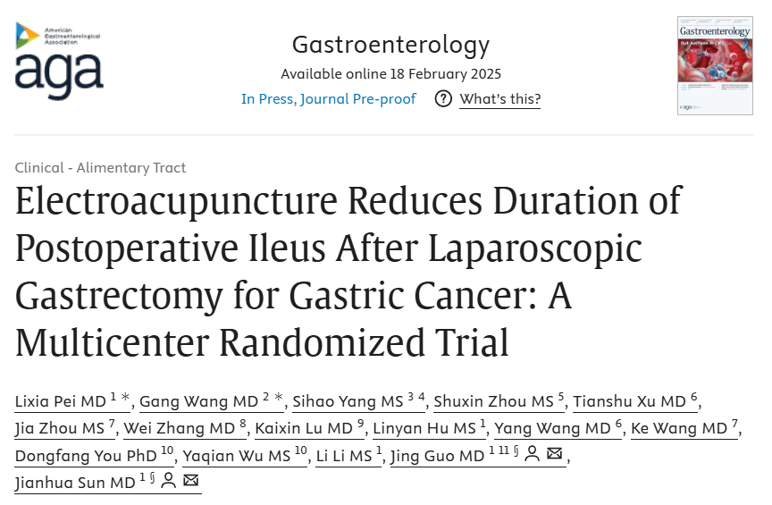 近日,best365足球官网孙建华教授团队在国际胃肠肝病学期刊Gastroenterology(中科院一区top,影响因子26.3)发表论文《电针可缩短胃癌腹腔镜胃癌术后肠麻痹时间的多中心随机试验(Electroacupuncture Reduces Duration of Postoperative Ileus After Laparoscopic Gastrectomy for Gastric Cancer: A Multicenter Randomized Trial)》。论文链接:https://www.sciencedirect.com/science/article/pii/S0016508525003737