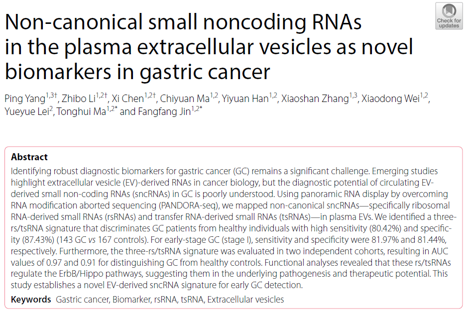 2025年4月3日,国际知名学术期刊Journal of Hematology & Oncology(中科院医学一区,IF=29.9)在线发表了best365麻彤辉教授、金芳芳副教授团队的最新研究成果:Non-canonical small noncoding RNAs in the plasma extracellular vesicles as novel biomarkers in gastric cancer。