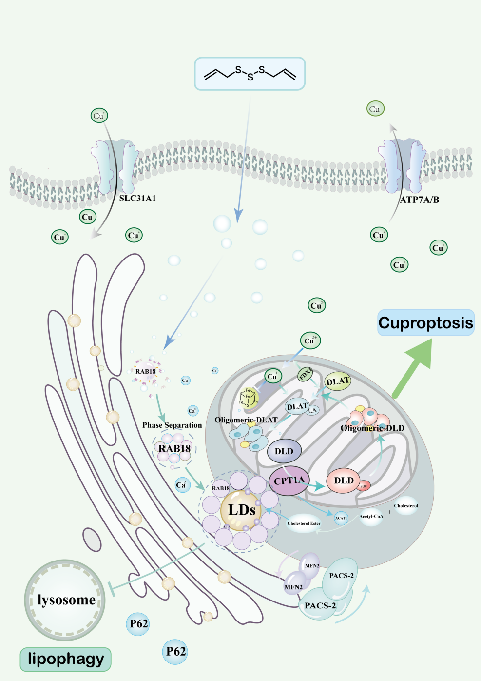 肝脏作为体内铜的主要储存器官,在维持铜的稳态中起着关键作用。当铜浓度超出正常生理阈值时,可引发一种新型的细胞死亡方式,称为“铜死亡”。然而,目前对铜死亡在肝纤维化中的执行机制仍未完全了解。大蒜作为一种药食同源植物,因其显著的健康益处和安全性而广泛应用。该研究首次发现,大蒜的主要活性代谢物的二烯丙基三硫醚(DATs)能够诱导活化型HSC铜死亡。机制研究揭示,DATs通过与RAB18的K153位点结合,诱导其发生液-液相分离,介导线粒体相关膜结构(MAMS)的形成,而MAMS的形成加速了RAB18的相分离过程,从而抑制脂滴自噬。相分离的RAB18招募CPT1A,增强DLD的琥珀酰化修饰,提升其酶活性,进一步在高铜环境下诱导铜死亡。文章聚焦前沿研究领域,针对临床重大疾病肝纤维化,首次阐明脂滴自噬和铜死亡之间的调控机制,具有重要的科学价值与临床应用前景。