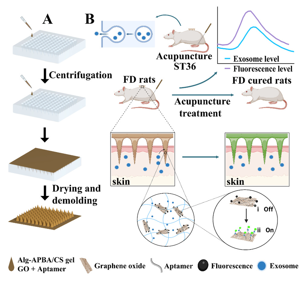 针灸治疗在改善慢性疾病方面取得了良好的临床效果,但其具体的作用机制仍有待深入阐明。研究表明,外泌体作为细胞间通讯的重要媒介,在针灸治疗过程中发挥着关键的信号传递和调控作用。为实时监测针灸过程中外泌体的动态变化,研究团队创新性地设计了一种贴片式微针传感器。该传感器采用海藻酸钠、硫酸软骨素为基质,与荧光基团修饰的核酸适配体偶联氧化石墨烯交联制备而成。当与靶标外泌体结合时,传感器可实现荧光信号的恢复和定量检测。该传感器具有高灵敏度、快速响应和原位检测等优势,为针灸治疗的科学原理和临床应用提供了一种无创、原位的应用工具,同时也为推动针灸疗法的现代化和标准化发展奠定了重要基础。