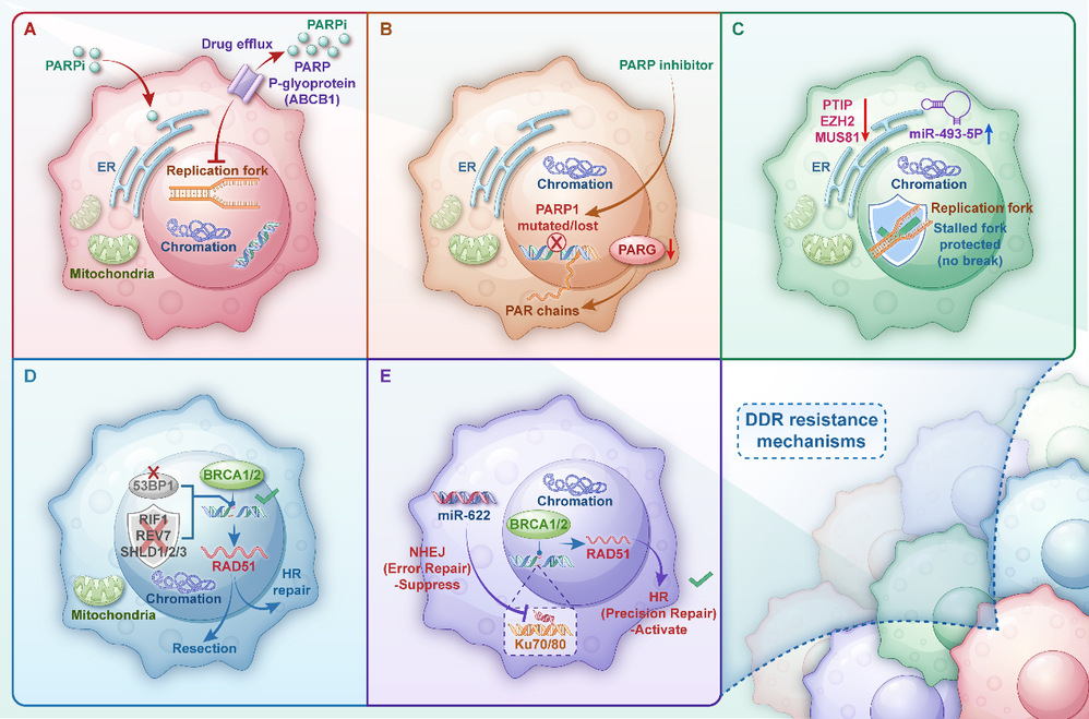 本研究系统梳理了DNA损伤应答(DDR)在肿瘤耐药形成与克服中的多重机制。研究指出,肿瘤细胞通过“修—停—躲”三类路径重塑对治疗的适应:一方面,HR、NHEJ、BER、NER、FA、TLS等修复通路与ATR/CHK1、ATM/CHK2检查点协同,快速清除化疗、放疗与靶向治疗诱导的损伤;另一方面,复制应激缓解与细胞周期重编程为癌细胞争取修复窗口。特别是在PARP抑制剂背景下,我们凝练出五大耐药轴线:同源重组(HR)功能恢复、PARP1/ PARG相关改变、复制叉稳定化、NHEJ抑制导致HR偏向,以及药物外排增强,并在泛癌种层面映射其分子图谱与耐药性节点。