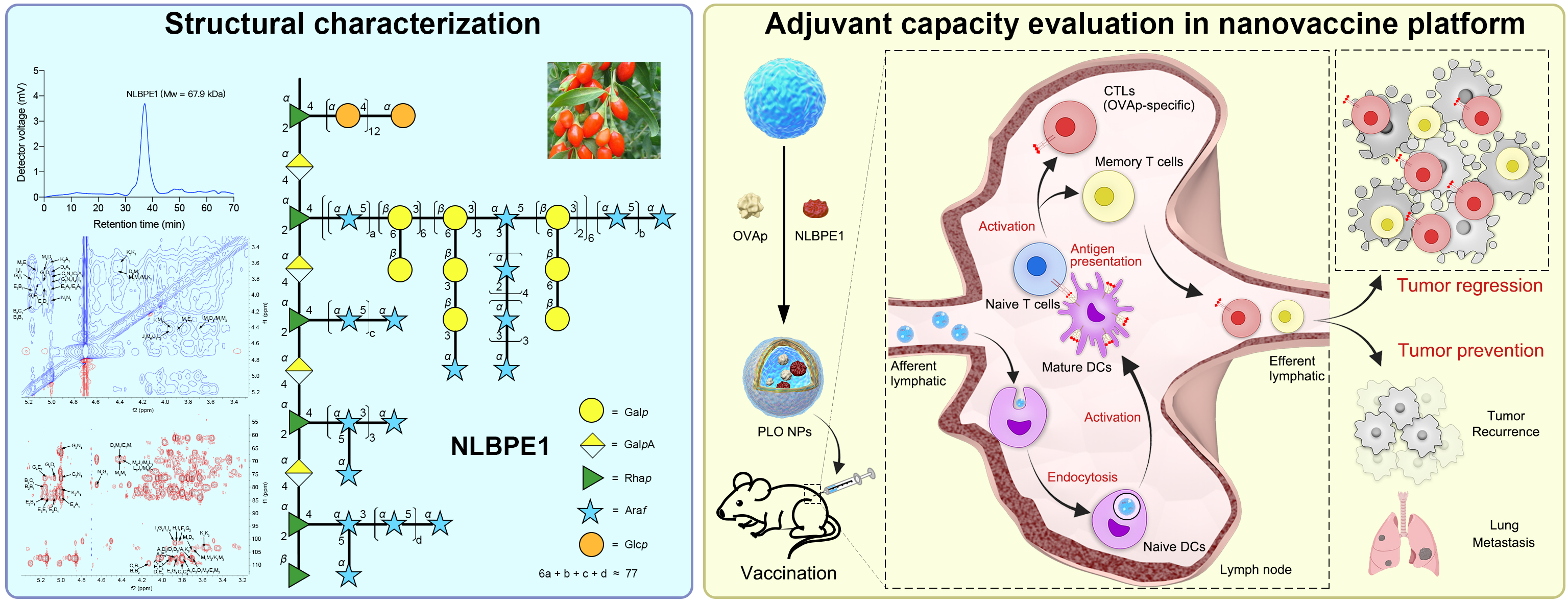 1029日,best365江苏省中药资源产业化过程协同创新中心段金廒教授/段嘉伦副教授团队在国际学术期刊Carbohydrate Polymers(中科院一区,IF12.5)期刊上在线发表了题为A structurally distinct arabinose-bridged arabinogalactan from Lycium barbarum as a TLR4-activating adjuvant for nanovaccine-based cancer immunotherapy的研究工作。该研究首次从枸杞子中分离并解析了一种均一化多糖NLBPE1,揭示了其作为疫苗佐剂在肿瘤免疫治疗中的应用潜力。