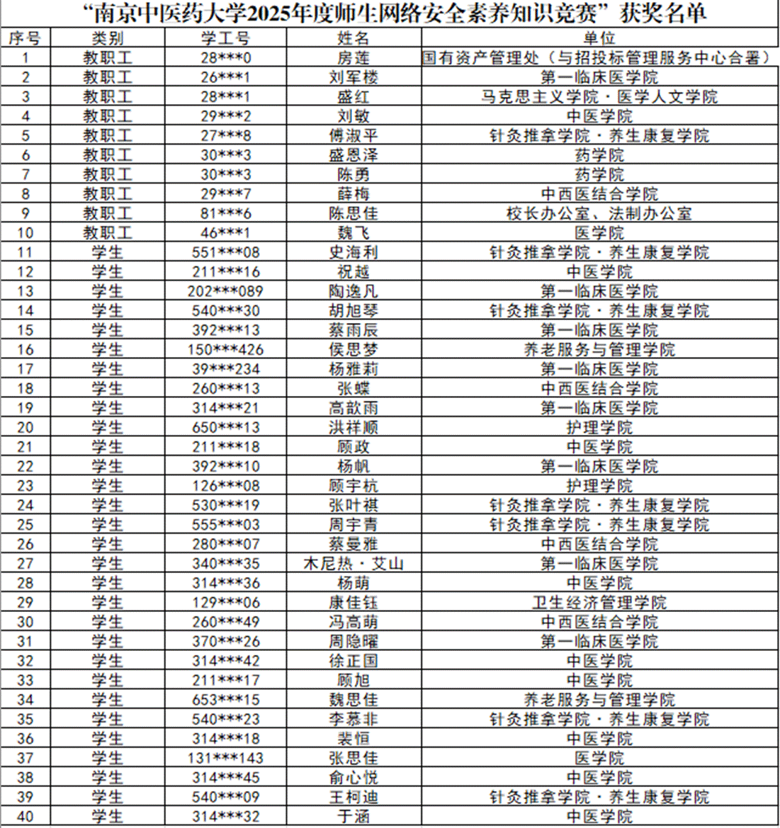 为深入贯彻《省教育厅办公室关于开展2025年江苏省教育系统网络安全宣传周校园日活动的通知》精神,进一步增强师生网络安全意识,提升网络安全防护技能,best365成功举办了2025年度网络安全素养知识竞赛。本次竞赛根据答题得分(大于等于80)随机抽取出获奖者40名(学生30名,教职工10名),现将本次竞赛获奖名单(见下文)予以公布,获奖者请于9月28日前工作时间内至图书馆112室现场领取奖品。